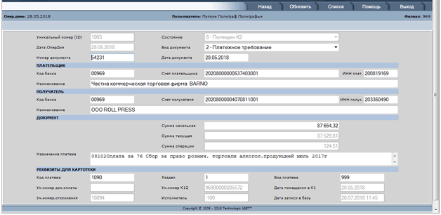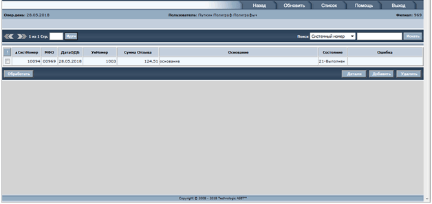 1 - В ожидании (введен пользователем филиала, ждет принятия клиентом Интернет-Банка) Если документ долго находится в состоянии 6–Списан К1, то посмотреть причину можно на списке требований столбец Ошибка. |