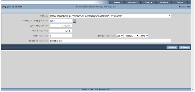 Клиент может Оплатить полностью, Оплатить частично, Отклонить полностью, Отклонить частично выставленное требование. При отказе от акцепта необходимо зайти в пункт меню Отклонения, нажать кнопку Добавить и внести следующие данные: • МФО• Уникальный номер платежного требования и нажать кнопку с тремя точками • Сумму отклонения • Номер и дату документа отклонения • Основание отклонения И нажать кнопку Записать. Если клиент дает согласие на оплату раньше срока акцепта, то нажать кнопку Оплатить, программно формируется проводка на оплату в АРМ Платежные операции. Если клиент дает согласие на частичную оплату, то сначала нужно ввести сумму отклонения в режиме Отклонения, а затем нажать Оплатить на остаток суммы требования.