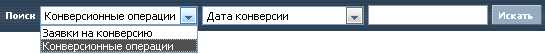 При входе в меню "Документы" => "Конверсия валют", открывается страница с таблицей, содержащей список конверсионных операций или заявок на конверсию валют текущего дня. Каждый документ представлен одной строкой таблицы. Для того чтобы отобрать (отфильтровать) документы по типу, воспользуйтесь раскрывающемся списком в разделе «Поиск».