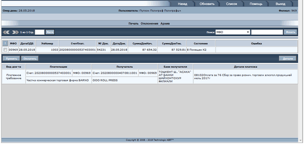 1 - В ожидании (введен пользователем филиала, ждет принятия клиентом Интернет-Банка) Если документ долго находится в состоянии 6–Списан К1, то посмотреть причину можно на списке требований столбец Ошибка. |